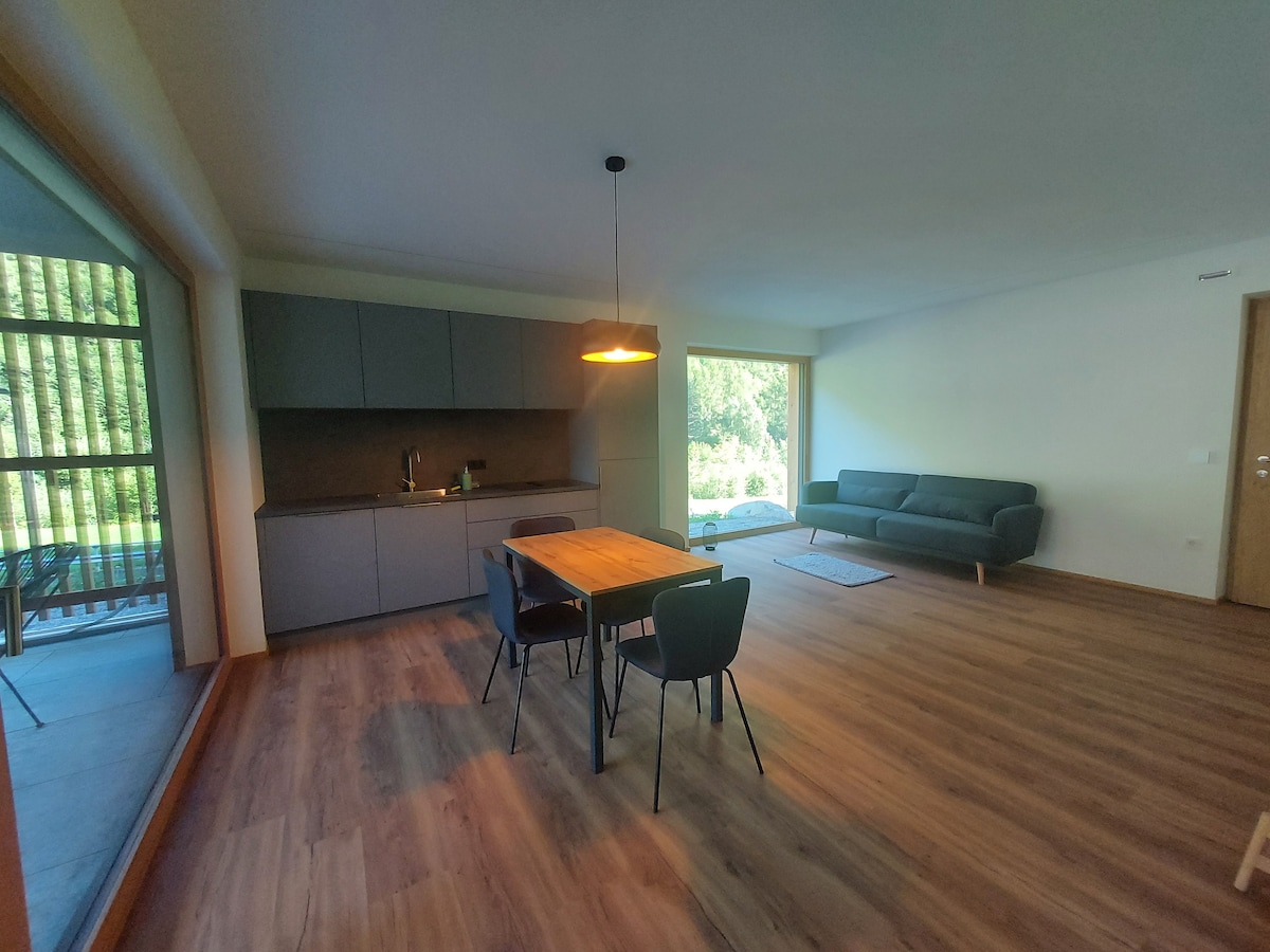 Hof Neuhaus, foirfe do lucht iarrtha na síochána. Tá an t - árasán saoire 82m ² suite ar fheirm agus is féidir le suas le ceathrar aíonna freastal air. Tá seomra suí thar a bheith fairsing san árasán ina bhfuil go leor adhmaid . Chomh maith leis an gcistin mhór, tá seomra leapa fairsing san árasán freisin ina bhfuil leaba dhúbailte déanta as adhmad péine ina bhfuil seomra folctha athchóirithe in aice láimhe. Is féidir an dara leaba dhúbailte a chur ar bun sa seomra suí. Tá ardán mór ag breathnú amach ar na Dolomites
