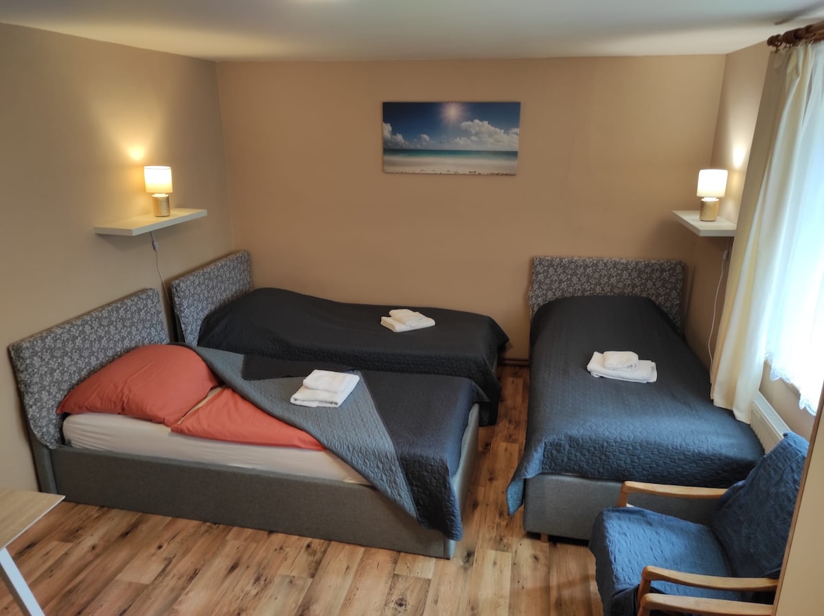Ar fhan tú riamh i dteach atá san áireamh sa tír??? Cuirimid an rogha seo ar fáil duit i dteach i stíl thionsclaíoch ag fíonghort beag ina bhfuil díon glas insiúlta. I samhradh te agus laethanta fuara, gheobhaidh tú aeráid thaitneamhach a dtacaíonn aisghabháil léi. In aice leis an teach tá gairdín ina bhfuil cónaiféir aibí, toir dhuilleacha agus faiche. Tá an gairdín fálaithe. Tá spás ainmnithe le páirceáil sa chlós os comhair an bhealaigh isteach chuig an teach.