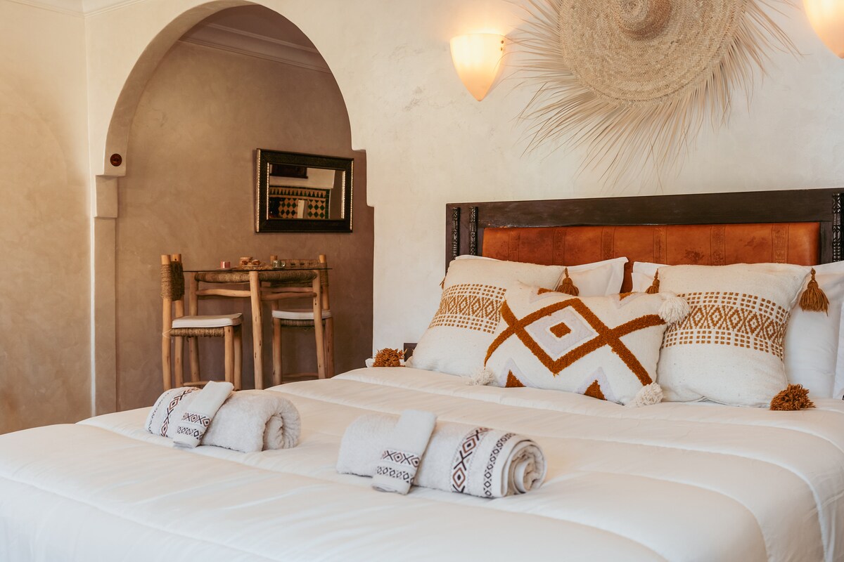 Fáilte chuig d'aisling phríobháideach i gcroílár Marrakech, stiúideo atá spreagtha go trópaiceach agus atá deartha timpeall ar choincheap íontach suaimhneach. Anseo, tugann gach mionsonra cuireadh duit do scíth a ligean, idir an dúlra, solas agus compord nua - aimseartha • an linn snámha bheag phríobháideach lasmuigh le haghaidh nóiméad folláine • Cithfholcadán lasmuigh a athnuachan, vibe nádúrtha • Ardán trópaiceach atá oiriúnach chun do scíth a ligean nó béile a roinnt • Maisiúchán tuisceanach le toin agus ábhair nádúrtha.