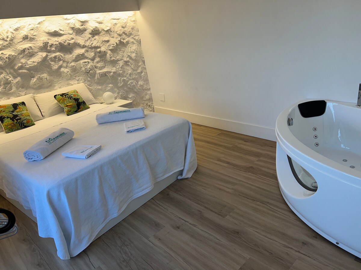 Comhcheanglaíonn an t - árasán gleoite seo só, compord agus radhairc iontacha chun eispéireas uathúil a chur ar fáil. Is tearmann príobháideach suaimhnis é an seomra leapa scoite, ag seasamh amach dá jacuzzi comhtháite galánta, atá oiriúnach chun do scíth a ligean i dtimpeallacht phearsanta theolaí. Foirfe do lánúineacha nó dóibh siúd atá ag lorg rud beag sómasach le linn a bhfanachta. Is é seoid an árasáin a lochtán príobháideach mór, óna bhfuil radhairc lánléargais iontacha ar Sierra Mágina.