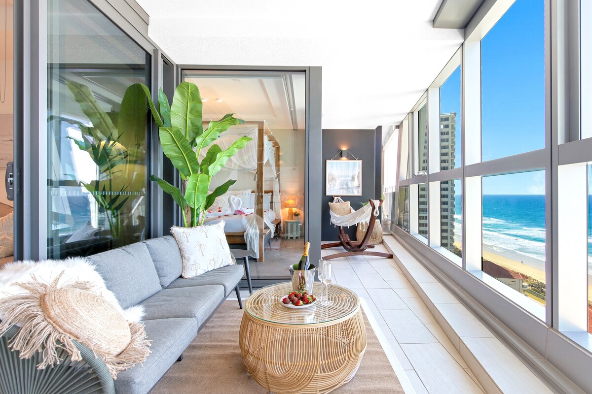 Árasán cois trá atá suite ar urlár ard ina bhfuil fuinneoga ó bhalla go síleáil, balcóin phríobháideach le Radhairc Iontacha ar an Aigéan agus rochtain ar an trá ar thrá Surfers Paradise díreach trasna an bhóthair. Tá leaba rí sa seomra leapa san árasán agus fill leaba thoilg dhúbailte sa tolglann. Cistin lánfheistithe, Wi - Fi ardluais, aerchóiriú, teilifíseáin le Netflix & YouTube, páirceáil saor in aisce agus níochán príobháideach iomlán. Tá rochtain ag aíonna ar an seomra aclaíochta, ar an spá, ar an sabhna, ar an linn snámha & Beárbaiciú in aice leis an linn snámha agus ar an díon.