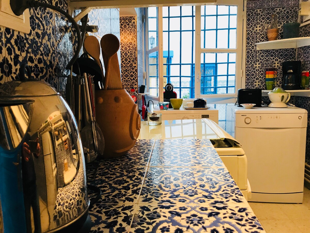 Tá neart spáis sa teach fairsing seo i gcroílár Sidi Bou Said do gach duine. Rinneadh an teach barántúil seo atá 300 bliain d'aois a chaomhnú go cúramach agus tá sé i riocht iontach. Ag fanacht anseo, beidh a draíocht uathúil agus atmaisféar síoraí an tsráidbhaile le brath agat, rud a fhágfaidh go mbeidh do thuras fíor-speisialta agus éagsúil ó gach turas eile.