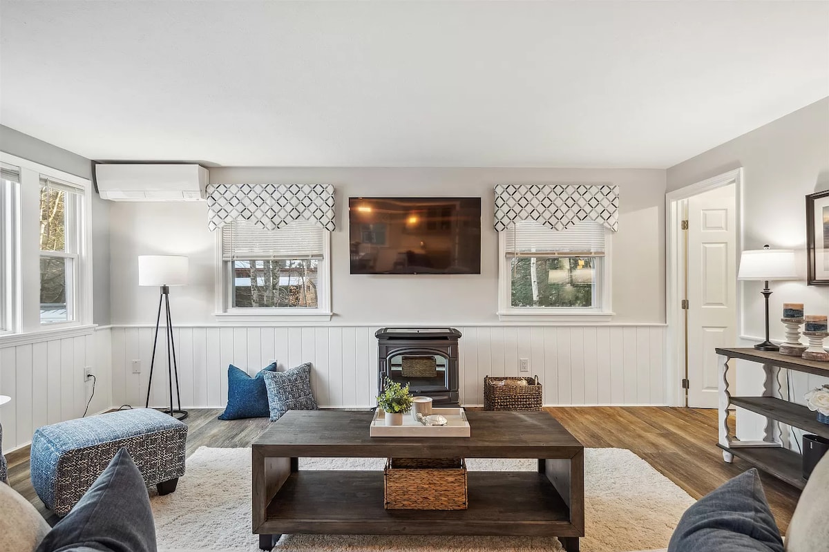 Fáilte chuig do thearmann foirfe ar an gcéad urlár. Cosáin choillearnaí ar an réadmhaoin, siúlóidí áitiúla cosúil le bog MT, eas álainn agus go leor eile. Tabhair leat do chadhcanna agus do chéaslóireacht Grafton Pond nó Pleasant Lake agus léim amach ón gcarraig ag Blueberry Island. Níl ach 30 nóiméad ó Limistéar Sciála Sléibhe Sunapee & 21 nóiméad ó Ragged MT Ski Resort. Cibé acu an bhfuil tú ag lorg sult a bhaint as na fánaí, suaimhneas an dúlra, nó beagán den dá rud, is é ár Airbnb an geata chuig eispéireas dodhearmadta New Hampshire.