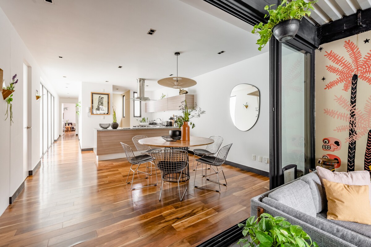 Lochta Teach Baile Ealaíne le neart solais Is spás iontach é a bhfuil go leor solais ann a léiríonn go leor solais nádúrtha ar fud na bhfuinneog ar airde dúbailte. Is músaem beag agus tearmann plandaí é i lár na cathrach. Stíl an - eicléictiúil ó phíosaí ceardaí Meicsiceacha ó Chiapas, Guatamala & Michoacan agus ealaín agus troscán Comhaimseartha & Seanda ó thréimhsí ama éagsúla ó gach cearn den domhan. Foilsithe i bPáipéar agus i bPláta mar seo: “Colorful City Home Featured by Nyde” sásta an t - alt a roinnt.