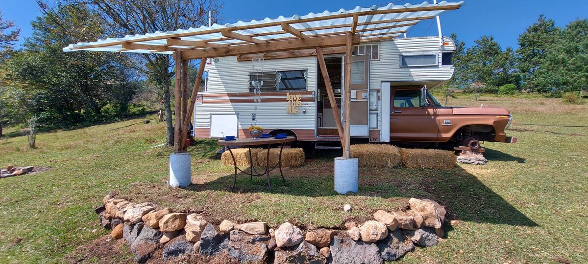 Padrisimo Camper Ula Ula ó na 80idí. Bain sult as suíomh draíochtúil na háite rómánsúla seo sa dúlra. PROMÓISEAN: Agus 2 oíche á gcur in áirithe, tá an 3ú ceann saor in aisce! (Tá srianta i bhfeidhm) Tá costas ag baint le gach cosán fánaíochta san fhoraois, droichead crochta, linnte snámha, tine champála, cluichí boird, agus bualadh le hainmhithe feirme. Tá costas breise ar an tobán, ar an marcaíocht ar chapall agus ar an temazcalli agus teastaíonn am ullmhúcháin agus áirithinte.