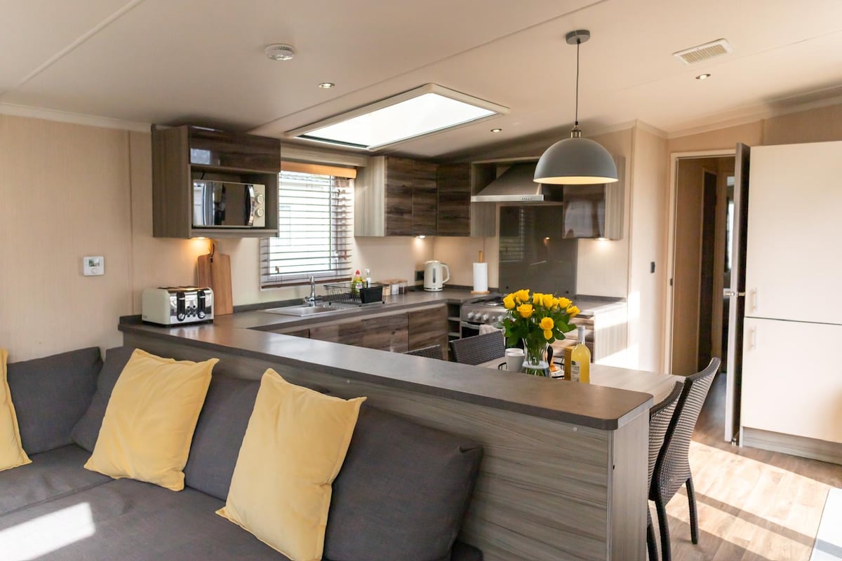 Iarscríbhinn sciobóil nua - aimseartha Cosy in aice leis an móinteán & cósta.