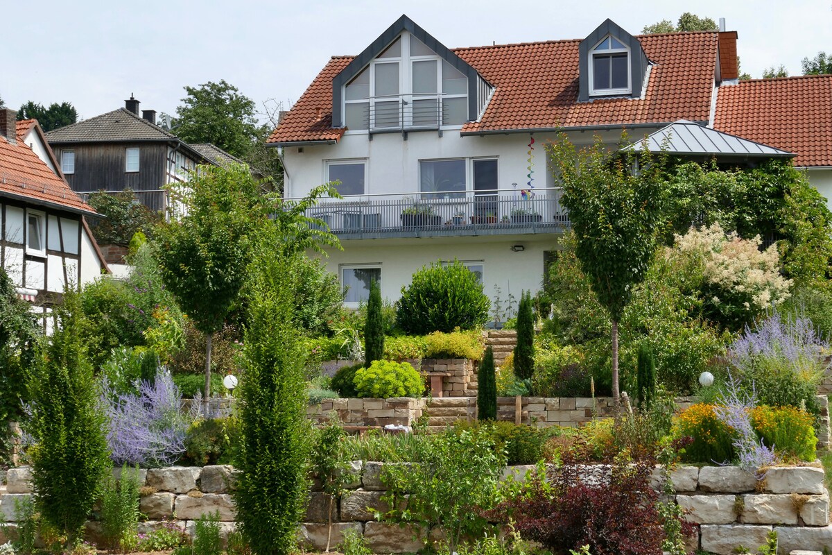 Tá an t - árasán aon seomra 37 m² suite ar urlár na talún i gclós scíthe i lár sráidbhaile Marburg - Heermershausen agus tá sé inrochtana ag an staighre comhroinnte. Tugann parquet fíor - adhmaid, urlár tílithe agus cistin adhmaid sholadach, troscán adhmaid soladach agus teicstílí nádúrtha cuireadh duit a bhraitheann go maith. Tá cithfholcadán siúil isteach sa seomra folctha fairsing, cuireann an chistin iarta ceirmeach dhá dhóire, micreathonnán agus sceite an aeir ar fáil. Tá Wi - Fi ar fáil, más gá, is féidir meaisín níocháin a úsáid freisin.