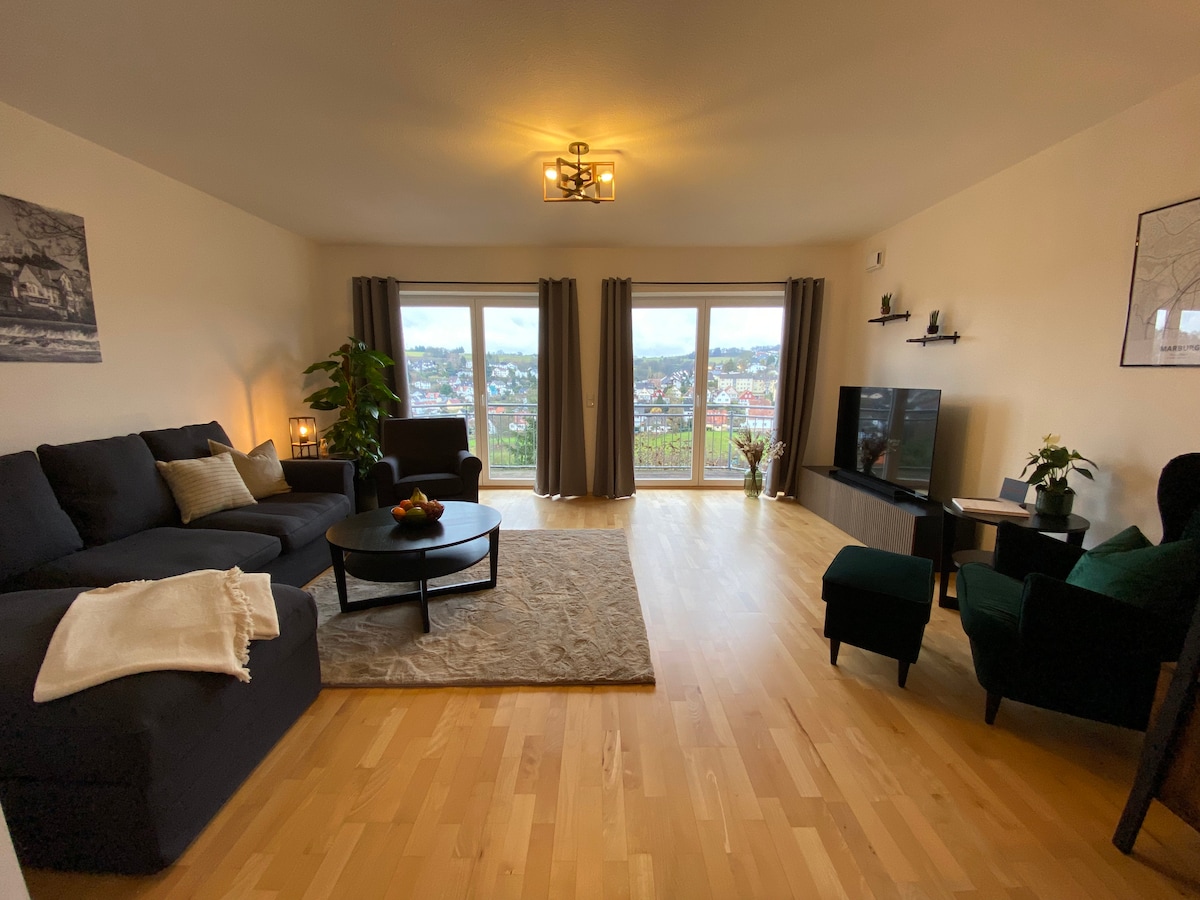 Árasán nua - aimseartha, nua - athchóirithe 80 méadar cearnach le balcóin agus radharc uathúil: Tá an t - árasán suite i gceantar Marbach. Siúlóid 15 nóiméad atá i lár na cathrach. Tá sé suite díreach ar imeall na foraoise agus tugann sé cuireadh duit do scíth a ligean tar éis cuairt a thabhairt ar an mBaile Uachtarach stairiúil, bríomhar. Tá an t - árasán ar ardchaighdeán agus feistithe nua - aimseartha (níl sé saor ó bhacainní). Tá seomra leapa, seomra folctha, seomra stórála agus áit itheacháin oscailte ann ina bhfuil aghaidh mhór fuinneoige.