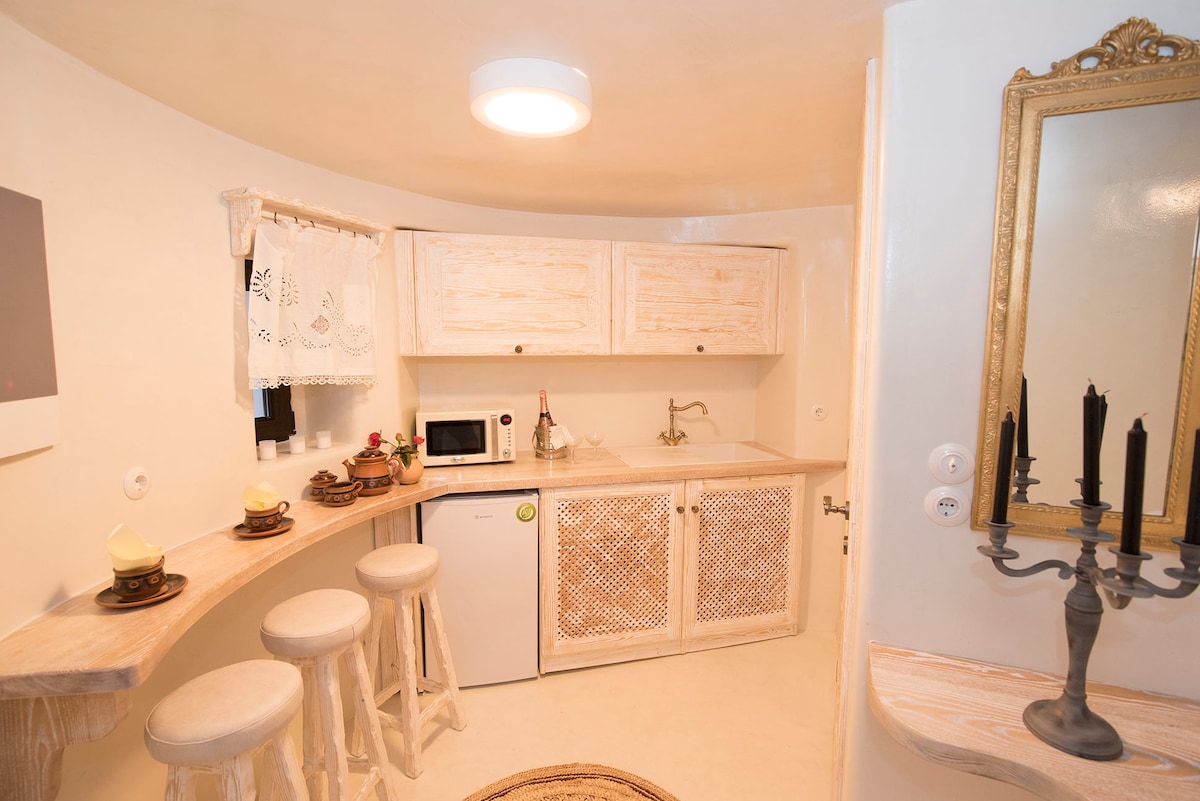 Ar imeall lonnaíocht thraidisiúnta Oia, ag breathnú amach ar an gCaldera agus ar luí na gréine cáiliúil Oia, tá ár Muileann Gaoithe traidisiúnta atá athchóirithe go hiomlán, a tógadh ar dtús in 1900. Tá an t-áit chónaithe uathúil seo ar thrí leibhéal nasctha le staighre inmheánacha agus is féidir le lánúin le beirt pháistí nó suas le ceathrar daoine fásta fanacht inti go compordach. Tá bricfeasta san áireamh, agus tá páirceáil saor in aisce ar fáil do na haíonna go léir.