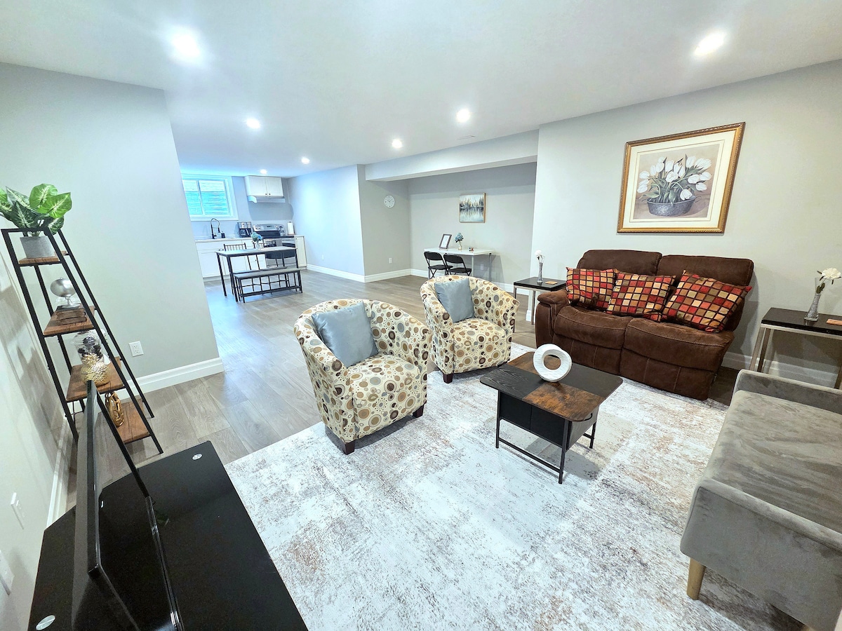 Céimeanna suite ó bhealach isteach pháirc chúige Pinery Cuirimid seomra íoslaigh príobháideach álainn ar fáil ina bhfuil an bealach isteach féin. Iascaireacht, fánaíocht, marcaíocht rothar agus go leor gníomhaíochtaí eile ar leac an dorais. Athsheomra mór coiteann le steirió, painéal cothrom H/D T.V. Wi - Fi, Netflix, YouTube Premium, Folcadán príobháideach le cithfholcadán, Seomra leapa le leaba na Banríona, an dara tocht dúbailte sa limistéar suí, Cuisneoir, Micreathonnán. Poll dóiteáin agus deic mhór. Úsáid beárbaiciú gáis nádúrtha, Hot Tub.Located just a 5 minute drive to the main strip