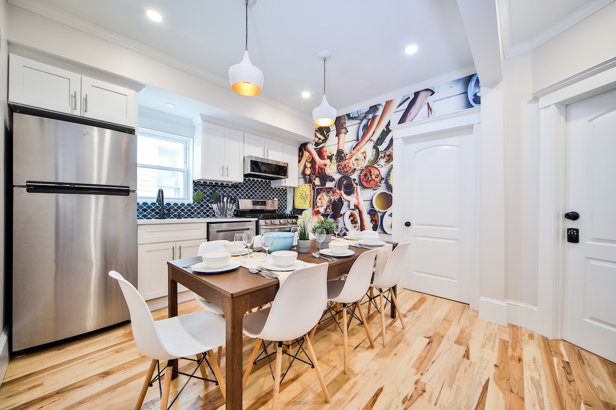 Nua - aimseartha agus nua - athchóirithe. Bíodh béile agat cois deice. Go hiontach le haghaidh lóistín/oibre - ón mbaile/teaghlaigh. Molta go hard sa ghlantachán. Féinseiceáil isteach. 5BR/2Bath. Cistin lánfheistithe Wi - Fi saor in aisce. Meaisín níocháin/triomadóir 4mil go Downtown, Convention, Fenway.25 go Casino, 35 go Pats PÁIRCEÁIL SRÁIDE SAOR IN AISCE Siúlóid 12 mns go dtí an Traein 18mn go dtí an t - aerfort Siúlóid 12m go dtí an Traein 8 mns go dtí an Trá Disney+ Tiomántán zú 8 mns In aice le hollscoileanna móra, beáir Is breá linn tú a óstáil agus táimid ag tnúth le tú a óstáil