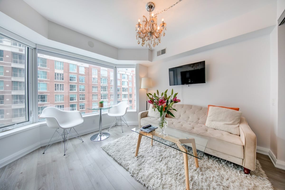 Mill thú féin le gach rud atá ar fáil in Yorkville san árasán seo atá maisithe go gairmiúil, atá spreagtha ag Nua-Eabhrac agus atá suite i gcroílár na háite is eisiacha in Toronto, áit a bhfuil páirceáil shaor in aisce le giolla páirceála ar fáil. Leapach mhór, tolg leapa sa seomra suí, bord beáir do bheirt, stáisiún oibre agus teilifíseán cliste 55" chun freastal ar do riachtanais go léir. Ealaín chomhaimseartha le healaíontóir áitiúil ar fud an áit, le troscán den scoth agus fearais Miele. Radharc ar an loch/ar an gcathair ó dheas trí fhuinneoga fairsinge ón urlár go dtí an tsíleáil.