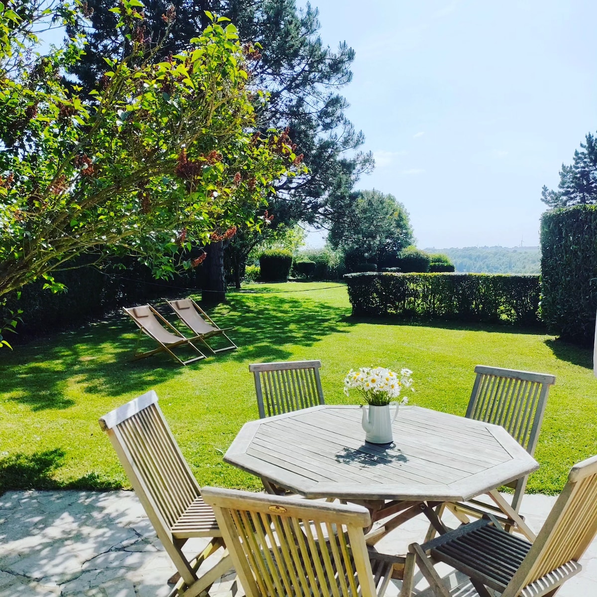 Sa tsraith tosaigh chun breathnú ar an fána an ghairdín, an abhainn , agus a ghlacadh folctha maith de duilliúr!! Teachín 70 m2, ardán oscailte ar thalamh mór coillteach agus bláthanna, teach neamhspleách, gan vis - à - vis. Seomra suí mór de 20 m2, fuinneog bhá, cistin feistithe, máistirsheomra leapa thuas staighre agus seomra leapa beag, cineál both. Go hidéalach, an - chiúin, siúlóid 5 nóiméad ó lár na cathrach, 3 km ón bhfarraige. Chomh maith le cosán rothair, bealach iascaireachta, agus ag crosbhóthar go leor siúlóidí!