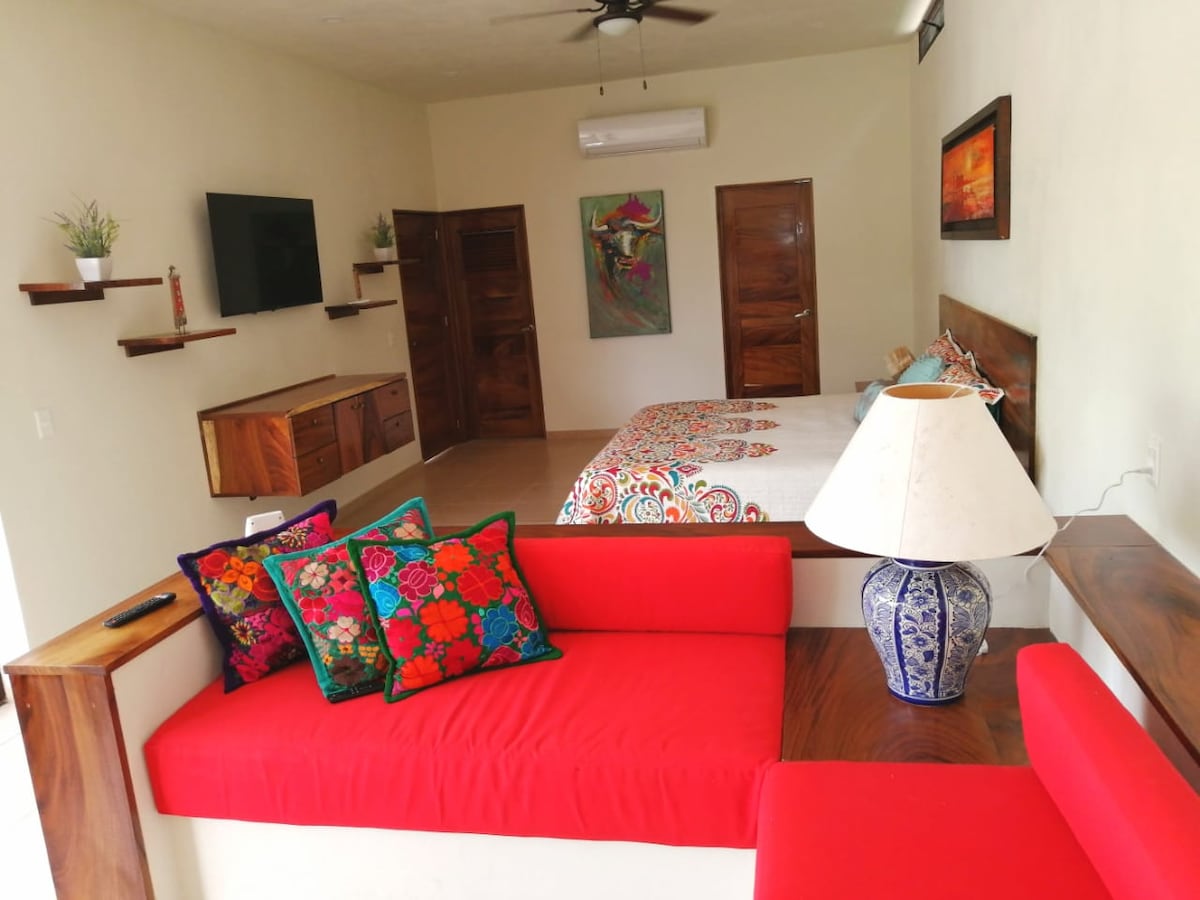 The Hideaway is one of three cozy studio apartments in Casa Cereza, Mexican decor, spacious patio overlooks the gated garden surrounded in bougainvillea. The beach is a short walk away, river is right outside the gate, fully equipped kitchen, AC, access to laundry room, fast WiFi. Close to stores, restaurants, hiking, fishing, snorkeling. You might see an iguana or two nesting in the trees alongside bananas and papaya trees. Safe and peaceful, Boca is a self sufficient little town.