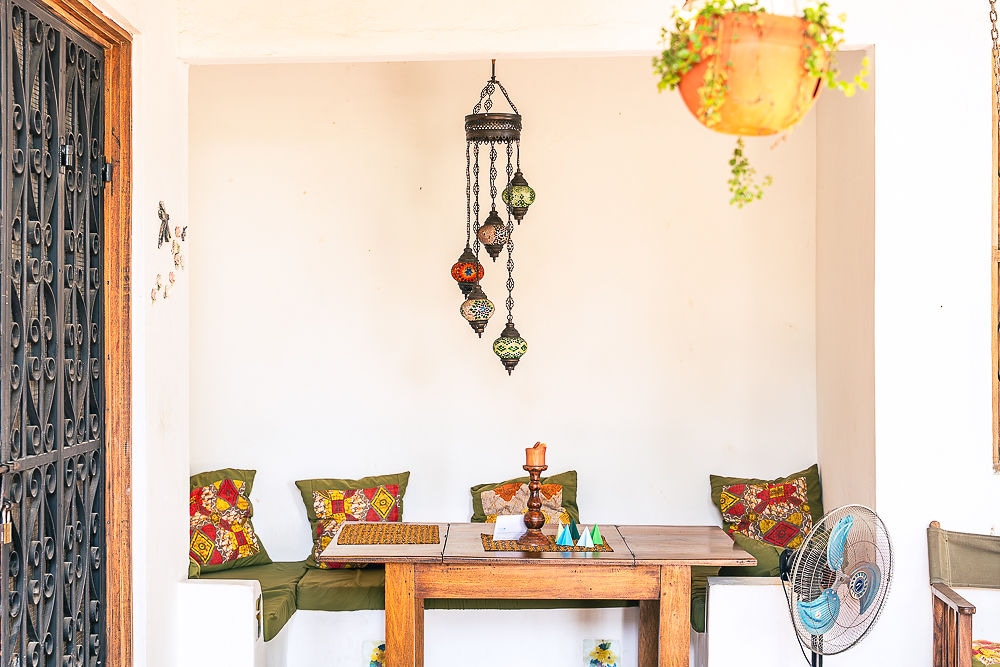 Tá rochtain ar an teachín styled Svahaílis seo trí chlós príobháideach i seanbhaile gnóthach Bagamoyo. Tá cistin atá feistithe go maith agus leithreas thíos staighre ar urlár na talún agus seomra leapa dúbailte ar an gcéad urlár ina bhfuil seomra folctha beag bídeach. Is áit iontach é an tolglann oscailte ar bharr an dín ar an dara hurlár chun do scíth a ligean agus tá radharc iontach ann ar an luí gréine an chuid is mó de na hoícheanta. Tá an teachín suite go háisiúil, gan ach siúlóid 5 nóiméad ar shiúl ón trá, caiféanna a bhfuil tóir orthu agus siopaí ealaíne.