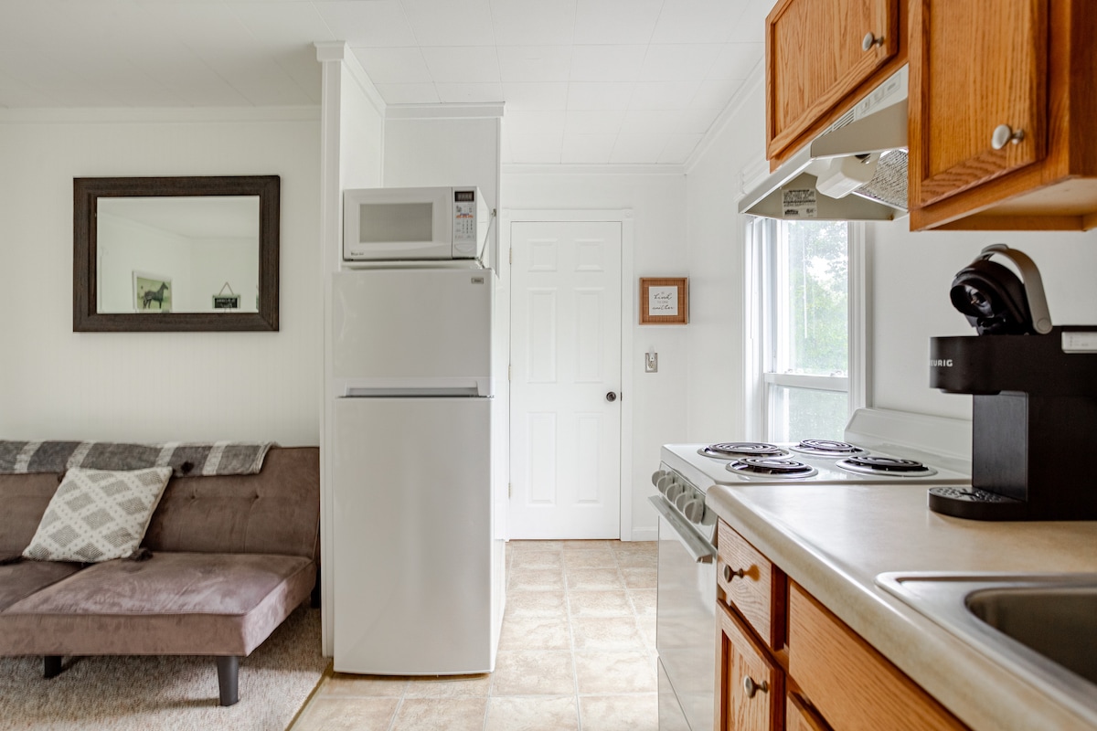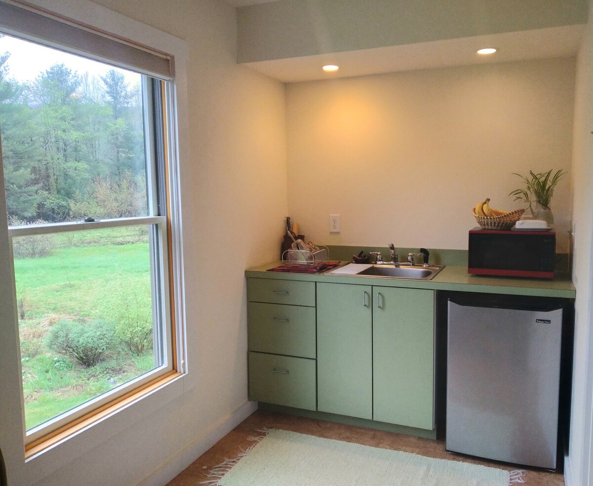 Saoire ghearr rómánsúil! Árasán stiúideo scoite 960 troigh chearnach: LEABA rí, tolg leathair/cathaoir lámh mheaitseála, síleálacha boghtaí, spéirléasta, gaothrán seaschéaslóireachta, soilse níos doichte, AC lárnach, urláir chrua - adhmaid, radhairc. Bealach isteach príobháideach, folcadán iomlán, HD TV w/ Roku (Netflix, Pandora, Hulu, srl.), bord bia, cistin iomlán, deasc, Wi - Fi, balcóin ag tabhairt aghaidheanna gréine. Easanna (chomh hard le Niagara) sa chlós tosaigh, cnoc sciála príobháideach sa chlós cúil. 6+ acra, ciúin. Radhairc áille. Linn snámha DÚNTA go sealadach.