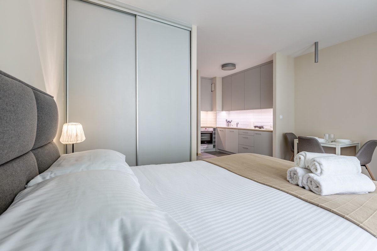 Is árasán compordach é an tÁrasán Ríoga i lár Vársá. In aice le Centrum Metro agus Stáisiún Láir. Árasán an - chiúin ag Sráid Σurawiej atá suite i ndoimhneacht eastáit tithíochta dúnta. Tá neart caiféanna agus siopaí grósaera sa cheantar. Na tochtanna ÓSTÁIN is compordaí! Is féidir leapacha ilchríochacha atá ceangailte le RÍMHÉID amháin 180x200 a scaradh leis féin. Tá a sheomra folctha féin agus cistinéad lánfheistithe san árasán.