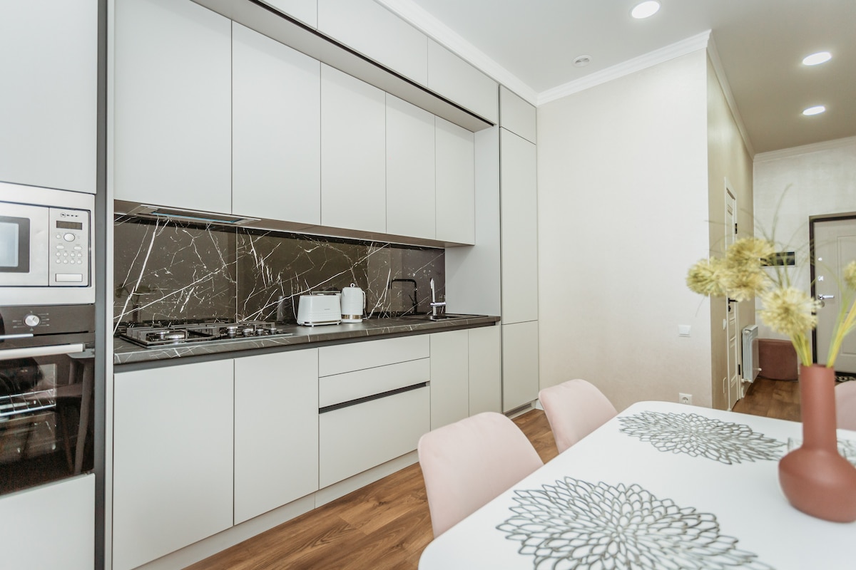 Fáilte chuig do thearmann uirbeach galánta in Chișinău! Lonnaithe in Áit Chónaithe sómasach Oasis (Râșcani), cuireann an t - árasán 55 m² seo radhairc éirí na gréine ar fáil ó bhalcóin phríobháideach, leaba mhullaigh rímhéide, tolg insínte, Teilifís Chliste le Netflix, agus Wi - Fi ardluais. Cuimsíonn an chistin lánfheistithe meaisín espresso Lavazza, miasniteoir agus eile. Bain sult as an gclós síochánta geataithe, Spa agus giomnáisiam ar an láthair (costas breise), agus rochtain dhíreach ar Kaufland agus ionad siopadóireachta. Compord, galántacht agus áisiúlacht - domsa
