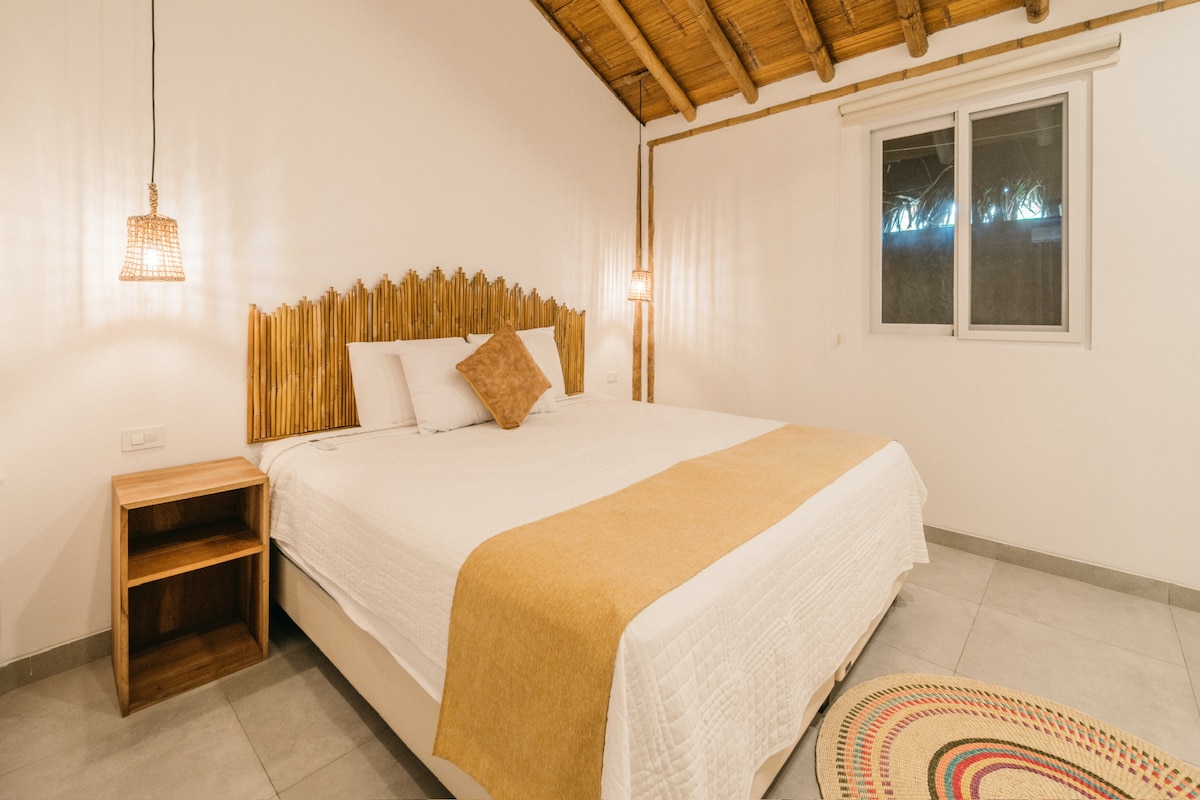 La suite combina elegancia, simplicidad y naturaleza, creando el ambiente perfecto para descansar, trabajar con tranquilidad o disfrutar de una escapada romántica en Olón. Al entrar, te recibe una sala luminosa con sofá amplio y detalles artesanales que crean una sensación de paz. La habitación principal cuenta con una cama King muy cómoda, iluminación cálida y un diseño natural en bambú que eleva la atmósfera de relajación.