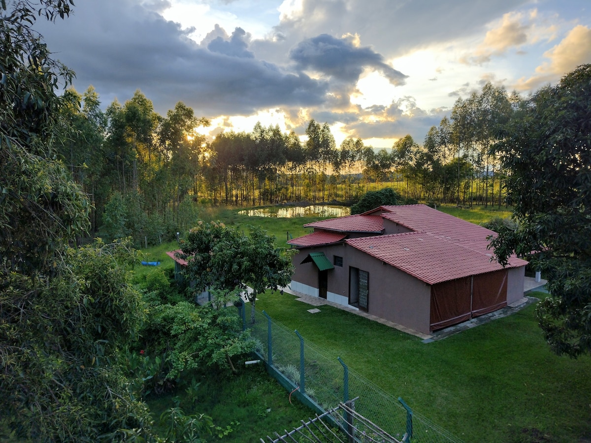 Relaxe com toda a família nesta acomodação tranquila.Nossa casa conta está na área rural, rodeada de verde, com uma bela área de lazer pra você poder aproveitar! Temos piscina aquecida, fogão a lenha e muito espaço pra você e sua família! Nossa casa possui dois quartos e uma ampla sala, cozinha inteira e externa totalmente equipada, ideal para finais de semana e festas! Acomodamos 6 hospedes em nossas camas mas permitimos que você leve colchões!