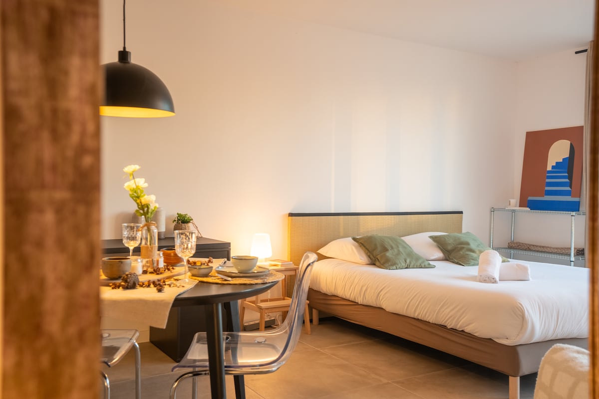 In aice leis an stáisiún traenach i gceantar gleoite na Meánmhara, seo an stiúideo iontach chun taitneamh a bhaint as d'fhanacht in Montpellier! Bialanna, caiféanna, lár stairiúil na cathrach, ceolchoirmeacha, siopaí: is féidir leat gach rud a dhéanamh de shiúl na gcos. Bain leas as an gclós freisin chun scíth a ligean agus chuimhneacháin speisialta a chaitheamh. Tá an stiúideo feistithe go hiomlán, ní mór duit ach do chásaí a oscailt! Soláthraímid braillíní, tuáillí agus an rud is gá don chistin (salann, piobar, ola...)
