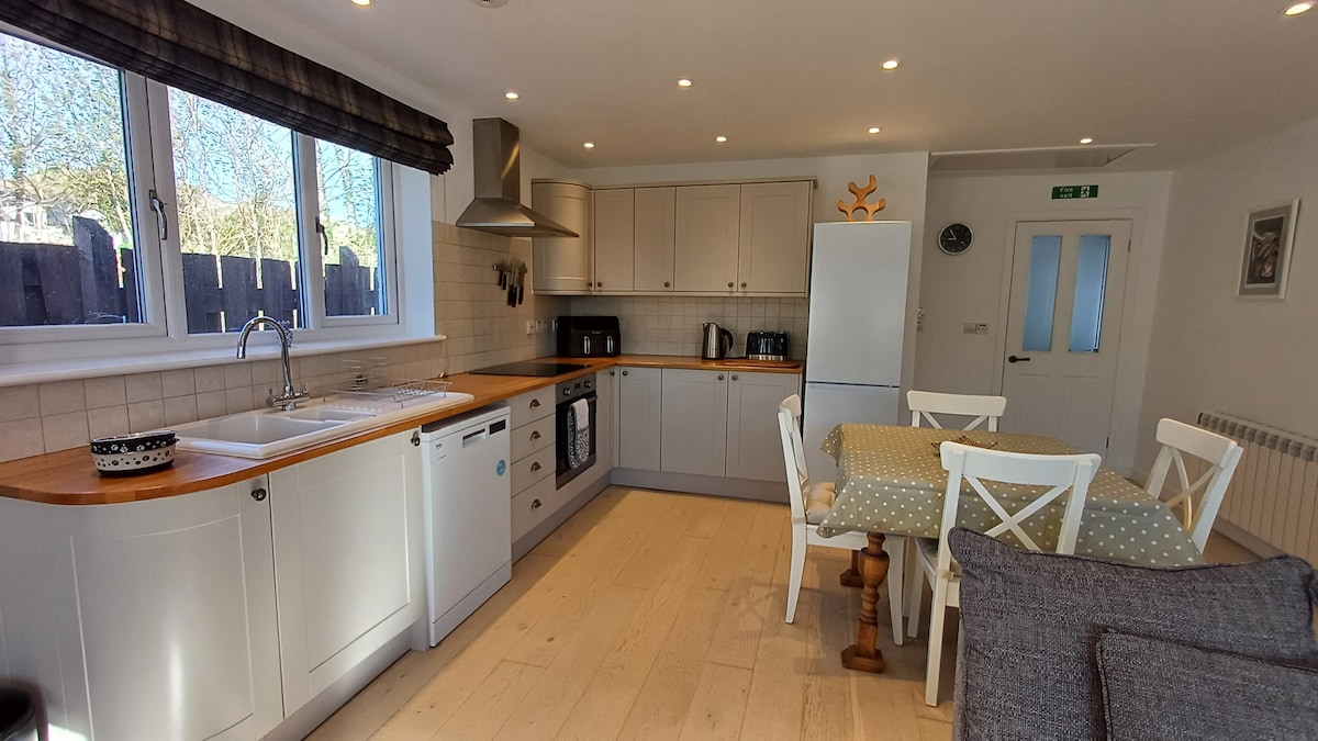 Árasán aoibhinn dhá sheomra leapa ar urlár na talún ag breathnú amach ar chuan fuadar Mallaig. Páirceáil saor in aisce ar an láthair. Suite go lárnach, siúlóid 10 nóiméad ón traein & thart ar 15 nóiméad ón mbád farantóireachta ar thalamh cothrom. Go leor báid farantóireachta go hOileán Sgitheanach, na hOileáin Bheaga & Inverie chomh maith le míolta móra & deilfeanna ag breathnú ar thurais bháid. Tiomáint deich nóiméad chuig gaineamh bán glórmhar Morar, tránna Camusdarach & Traigh. Rochtain éasca chun cnoic agus tuath a iniúchadh. Neart tithe tábhairne & bialanna faoi fhad siúil ón árasán.