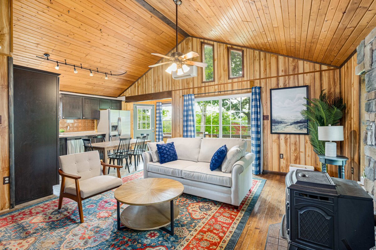 Is sealla nua - athchóirithe é Stoney Peak Chalet le síleálacha arda, tonna solais, tobán te úrnua, gríoscán, poll dóiteáin, deic illeibhéil le neart suíocháin do do ghrúpa, timpeallaithe ag radhairc áille. Tar agus déan iniúchadh ar shléibhte WV ag an saoire ghearr uathúil seo. Na buaicphointí: - Lig do scíth sa tobán te nua! - Gríoscán & croch amach ar an deic - Scannáin srutha nó an tsraith is fearr leat ar ár SmartTV (wifi) - Tiomáin 10 nóiméad go Páirc Stáit Cacapon nó 20 nóiméad go Berkeley Springs, an oiread sin le feiceáil!