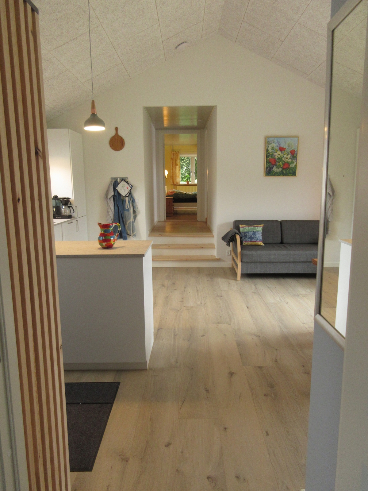 teachín adhmaid nua-aimseartha, cluthar le cistin ina bhfuil cuisneoir, micreathonnán agus sorn, mion-oigheann leictreach. Téamh urláir sa teachín. Leithreas, cithfholcadán le humar uisce te 30l, (cithfholcadh gearr) Leaba dhúbailte, tolg, bord itheacháin, lochtán beag. Teilifís agus wifi. Tá an teachín suite sa ghairdín in aice lenár dteach. Táimid i mo chónaí taobh amuigh den sráidbhaile Hjortshøj ar imeall na foraoise agus gar don mhótarbhealach. Tá fáilte roimh mhadraí. Ar cíos le línéadach leapa agus tuáillí. Fad go Århus 12 km, go dtí iompar poiblí 600m. Níl an teachín oiriúnach do thréimhsí fada.