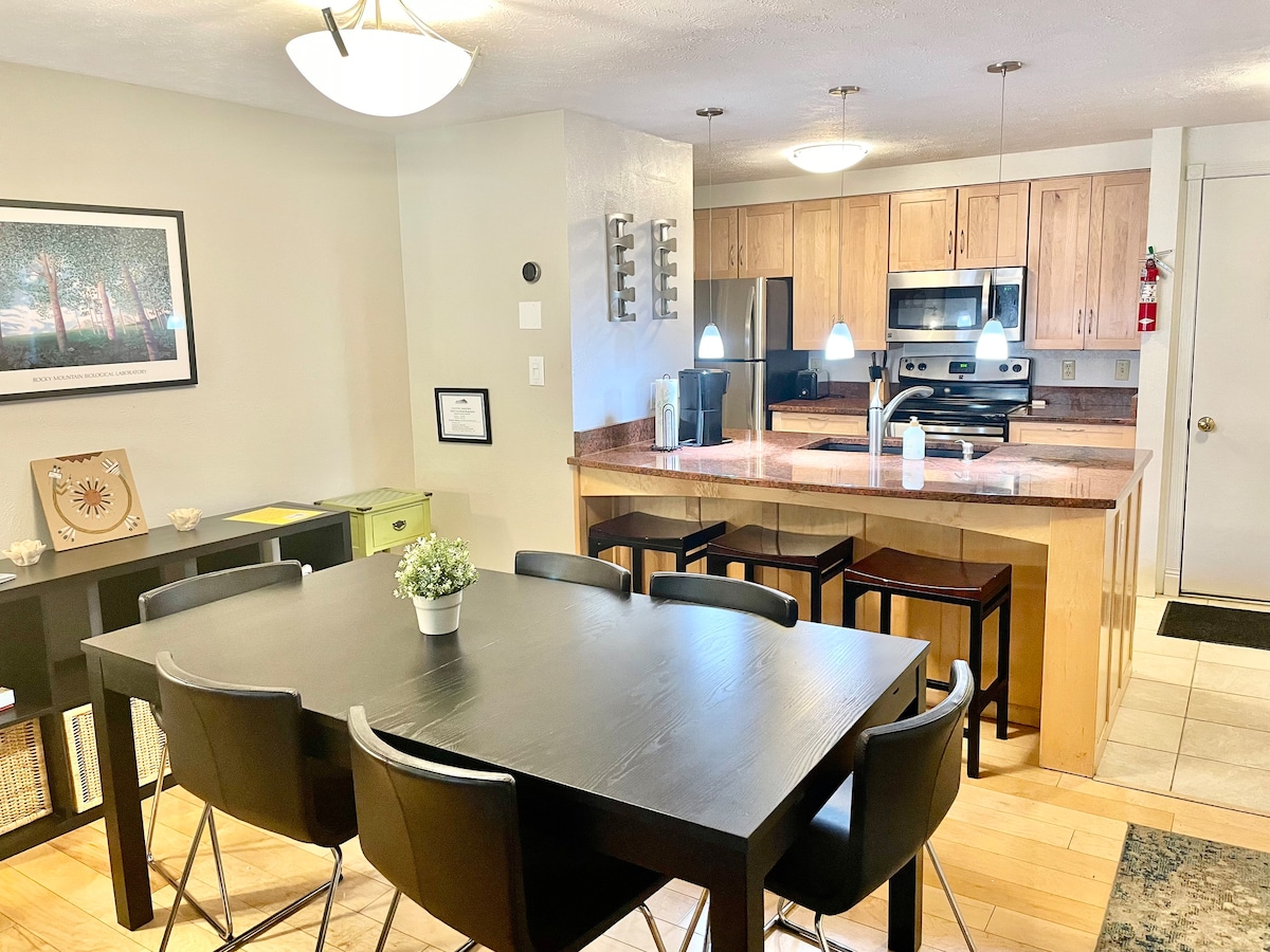 **Tá an Tobán Te dúnta go séasúrach ón 11 Deireadh Fómhair go Lá an Altaithe 2025** Árasán glan, cluthar agus geal ar Mount Crested Butte. 2 Sheomra leapa, 2 Sheomra folctha agus lochta mór. Suite 400 troigh ó bhun Crested Butte Mountain Resort agus rochtain dhíreach ar ardaitheoir Snow Queen. Nuashonraithe agus feistithe le gach rud do do Shaoire Ghearr ar Shliabh. Tá 2 spás leithdháilte ar ár n-aonad agus tá 2 chead páirceála ann d'fheithiclí ár n-aíonna. Baile MT. Crested Butte Uimhir Cheadúnais do Lóistín ar Chíos Gearrthéarmach: 303060