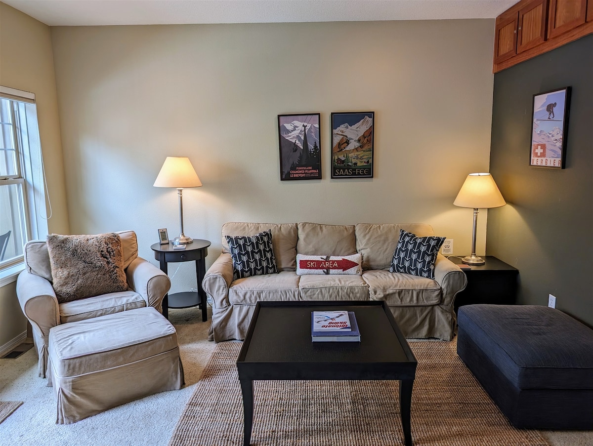 Suíomh! Suíomh! Suíomh! Bain sult as an dá urlár uachtaracha den déphléacs sealla sléibhe seo atá suite go lárnach, 1704 troigh chearnach le radhairc ar Bhabhla Sciála agus fuaimeanna suaimhneacha Camp Creek ag rith tríd an gcúlchlós. 4 bdrm/6 leaba/2 sheomra folctha, le deiceanna fillte. 1 Rí, 1 Bhanríon, 2 Chúpla, agus 1 leaba bhuinc Dhúbailte/Dhúbailte, is féidir leis an aonad suas le 9 nduine a óstáil. Go hiontach do theaghlaigh! Níl ann ach bloc ón Siopa Ginearálta, an Huckleberry, Charlie's, an Ratskellar, agus an High Mountain Cafe. Meaisín níocháin/triomadóir agus beárbaiciú freisin!