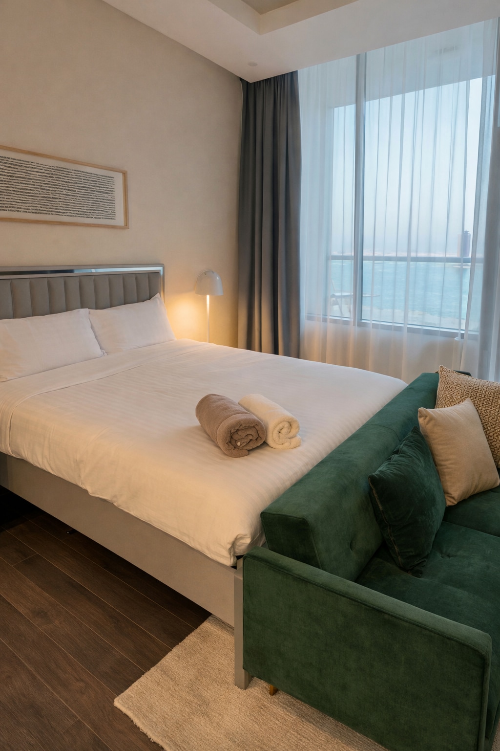 Fáilte chuig do thearmann sómasach i gcroílár Bhairéin! Agus é suite ar an 24ú hurlár d'ardú nua - aimseartha, tá radhairc iontacha ar spéirlíne na cathrach san árasán 1 sheomra leapa seo. Deartha le haghaidh compoird agus stíle, tá feistis chomhaimseartha, cistin lánfheistithe, agus na saoráidí go léir a theastaíonn uait le haghaidh fanacht suaimhneach inár dteach teaghlaigh! Dúisigh go vistas iontacha, lig do scíth sa limistéar fairsing maireachtála, agus bain sult as ár gCóras Baile Cliste, Ag baint úsáid as Alexa chun cuirtíní, teilifís agus glas dorais a choigeartú agus a mhodhnú!