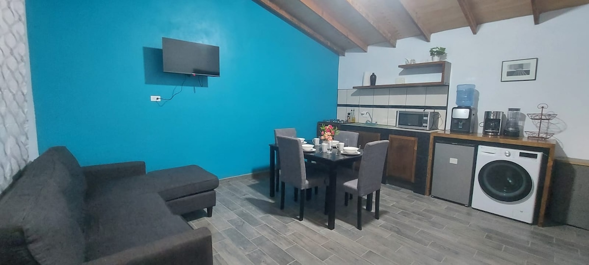 Éalaigh go Cactus Corner – casita teolaí i ngort Huerta Don Chano, áit a bhfuil bruacha abhann méith agus crainn mhangó thart timpeall. Díreach 15 nóiméad ó thránna Bahía Concepción, cuireann an casita seo Wi - Fi Starlink, cistin iomlán, paitió príobháideach, bia ar an láthair, agus cadhcáil ar an abhainn in aice láimhe ar fáil. Béilí a shábháil ag an mbialann amharc ar an abhainn ar an láthair, nó téigh ar shiúlóid ghearr cúig nóiméad chuig seastán taco gleoite lena radhairc abhann féin, beár, agus atmaisféar suaimhneach crann pailme. Siúil go dtí an baile nó trá El Faro!