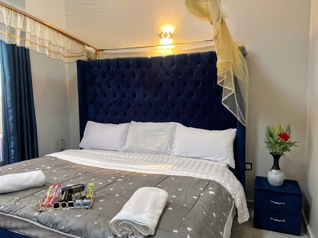 Tá an áit ghalánta fhairsing seo le fanacht foirfe do thurais ghrúpa. Cuireann sé dhá sheomra leapa ar fáil ina bhfuil leaba amháin de mhéid an Rí agus leaba amháin de mhéid na Banríona, dhá sheomra folctha agus dhá bhalcóin. Tá an tÁrasán lárnach i mbaile Munyonyo, atá suite 2 nóiméad ó phríomhbhóthar Munyonyo, thart ar 30 -45 nóiméad sa charr ón aerfort, 5 nóiméad sa charr ó rochtain ar an loch, laistigh de insiúlta go dtí achar chuig bialanna cócaireachta, beáir, cógaslanna éagsúla, rochtain éasca ar iompar modhanna poiblí.