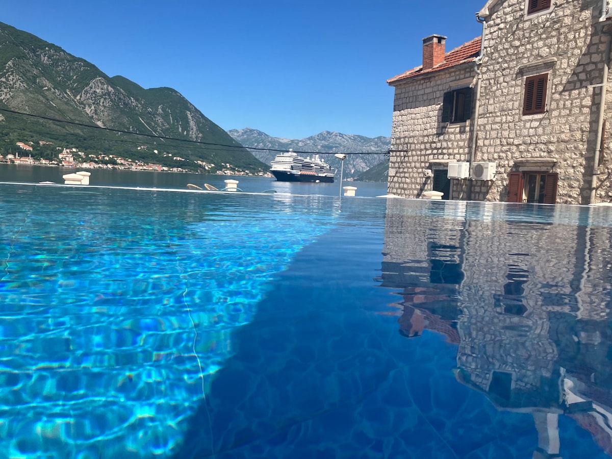 Suite 50 méadar ón bhfarraige, Teach le dhá sheomra leapa, ardán mór agus radharc álainn ar an bhfarraige a sholáthraíonn stiúideo aerchóirithe le Wi - Fi saor in aisce, teilifís satailíte agus páirceáil saor in aisce. Tá an margadh 50 méadar ón réadmhaoin, agus tá an trá bheag 1 km ar shiúl. Tá cistin, beárbaiciú agus seomra folctha príobháideach sa teach. Tá teach thart ar 2.3 km ón Seanbhaile Kotor, ina bhfuil sean - Ardeaglais Saint Tryphon agus Fortress San Giovanni. Tá Trá fhada Jaz 10km ar shiúl. Tá aerfort Tivat 7km ón réadmhaoin.