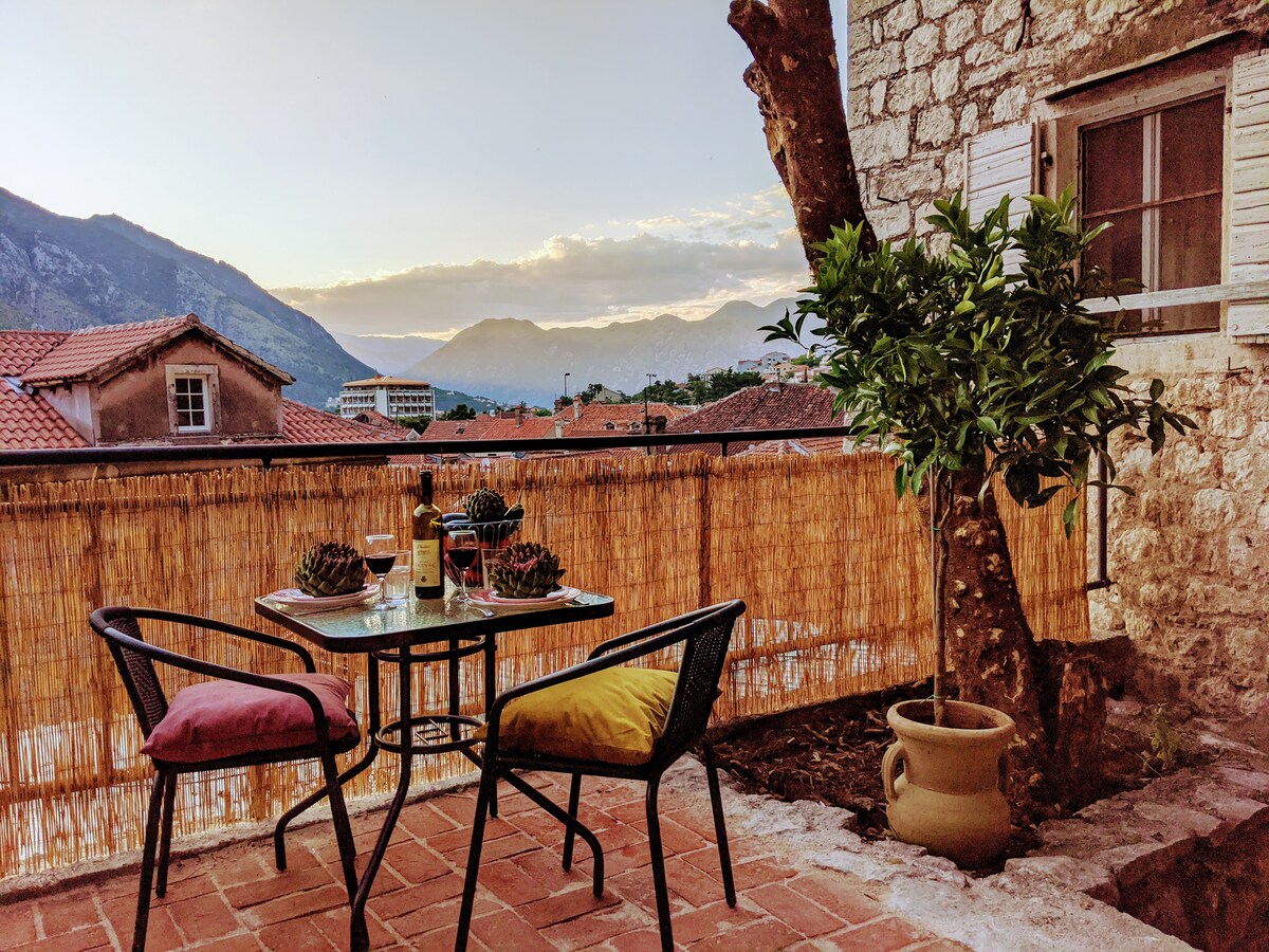 Díreach i lár oidhreacht an domhain de Kotor Old Town, téigh suas 54 céim chuig an stiúideo iontach seo le gairdín agus lochtán príobháideach ina bhfuil radhairc iontacha ar na díonta, ar na sléibhte máguaird agus ar an bhfarraige. Tá na ballaí go léir nochta cloch nó carraig ar ais go grámhar. Tá an chistin ceaptha go maith agus tá an maisiúchán nua - aimseartha, éadrom agus compordach. Tagann sean le chéile nua.