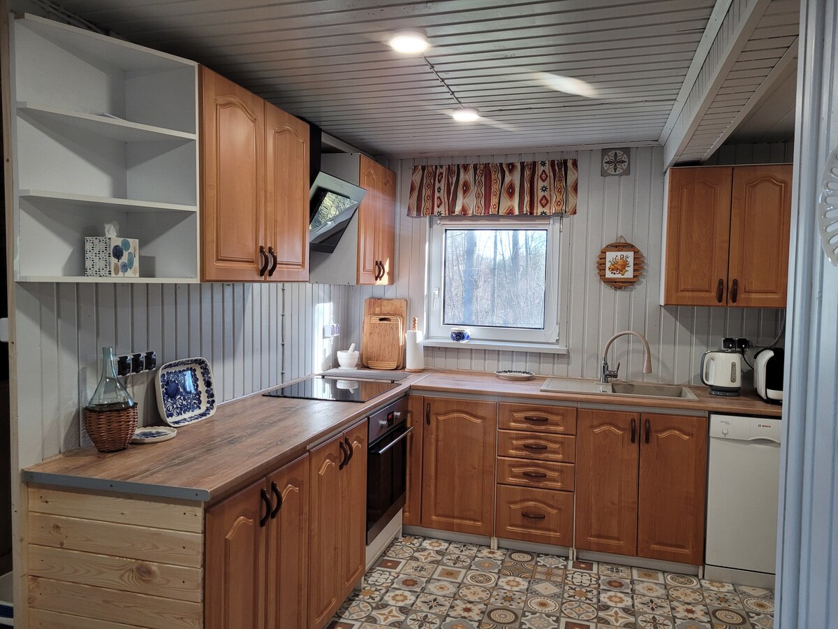 Teachín ó cheann ceann na bliana i sráidbhaile Oszkina. Tá Loch Sejwa 200 méadar ar shiúl. Ar imeall na foraoise. Ar an mbunurlár tá seomra suí ceangailte le cistin lánfheistithe. Tá bealach amach díreach chuig an ardán sa seomra suí. Seomra folctha le cithfholcadán. Thuas staighre, tá dhá sheomra ann. Tá leaba dhúbailte ag ceann acu, tá dhá leaba shingil ag an gceann eile. Tá aerchóiriú, crochadáin éadaí, drisiúr i ngach seomra. Páirceáil . Tá sabhna san áitreabh. Tá gríoscán beárbaiciú, troscán paitió, tolgairí gréine ann freisin. Tá an beart ar fad fálaithe.
