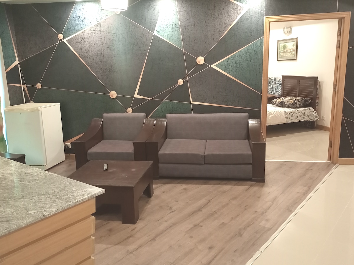 Fáilte chuig ár svuít uathúil ghalánta, an rogha iontach dóibh siúd atá ag lorg compoird agus scíthe. Tá leagan amach fairsing ar fáil sa seomra seo atá deartha go tuisceanach. Suite i suíomh síochánta, tá an seomra suite maisithe go cúramach chun atmaisféar teolaí ach nua - aimseartha a chruthú. Cuirimid spás ar fáil duit a bhraitheann mar theach as baile. Cuir an svuít fáilteach seo in áirithe inniu agus bain sult as lá sona beannaithe. Le dea - mhéin, Bushra & Muneeb