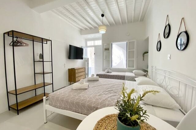 Tá ár réadmhaoin teaghlaigh suite go foirfe i lár Mykonos Town, rud a thugann rochtain éasca duit ar gach rud atá le tairiscint ag an oileán bialanna, siopaí, beáir, agus níl sna sráideanna áille foirceanta ach céimeanna ar shiúl. Tá compord agus suíomh den scoth san árasán, agus cinntíonn na saoráidí atá ann fanacht gan uaim agus speisialta. Is é an bonn foirfe é chun Baile Mykonos a iniúchadh de shiúl na gcos agus lánfháiltiú as a fhuinneamh agus a atmaisféar bríomhar!
