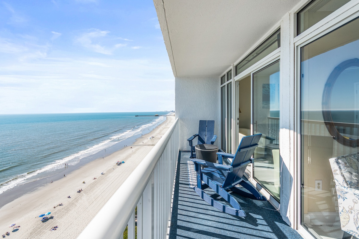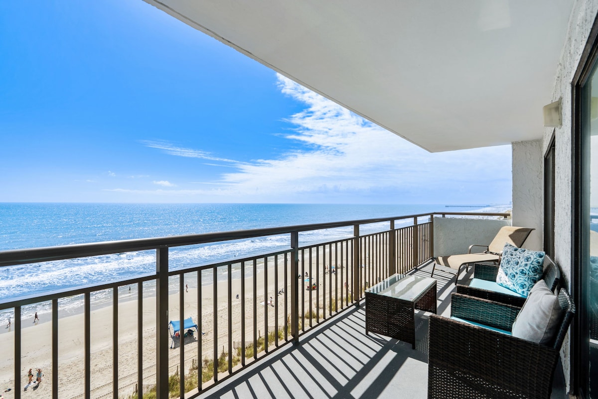 🌊 Oceanfront Escape | Athchóirithe as an nua 2025 Dúisigh le fuaim na dtonnta agus radhairc lánléargais an Atlantaigh ó do bhalcóin phríobháideach! Tá décor nua - aimseartha, urláir adhmaid, tolg codlata agus tochtanna den scoth le feiceáil san árasán 2BR nua - aimseartha galánta seo i gcroílár Myrtle Beach. Bain sult as cistin iomlán, meaisín níocháin/triomadóir, agus saoráidí an ionaid saoire — linnte laistigh/lasmuigh, Jacuzzi, abhainn leisciúil, agus crios splancscáileáin do pháistí. Céimeanna ón Ríocht Teaghlaigh, ón gClárchosán, agus ón 2ú Cé Ave — tá do shaoire fhoirfe cois cósta ag fanacht leat!