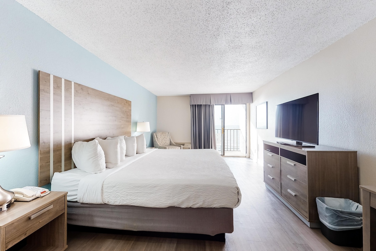 Discover your oceanfront retreat designed for couples or families with up to 6 guests who want resort amenities like pools and a lazy river, easy beach access, and a central location close to all that North Myrtle Beach has to offer! This beautiful 1-bed, 1-bath, 4th-floor oceanfront condo at Beach Cove Resort features a private balcony with views of the ocean and lush treeline.