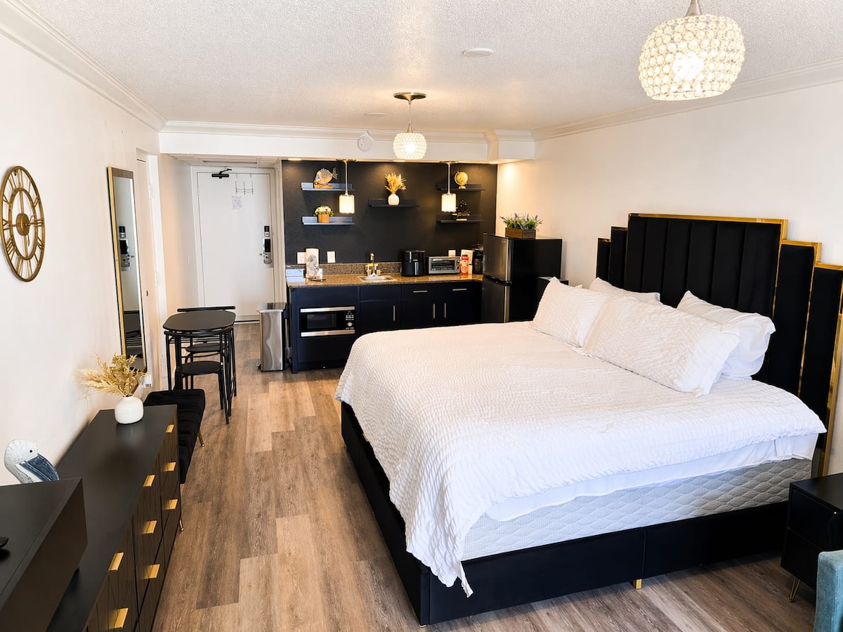 NÍ 4 leaba, fabht teicneolaíochta - 23+ bliana d'aois le fáil ar cíos in aghaidh HOA Tá leaba mór ardaithe le radharc ar an aigéan i Stiúideo le Balcóin ar imeall na farraige. leaba dhúbailte bhog faoi - ar rothaí le haghaidh rochtain éasca. Teilifís chliste 55" rothlach suite ar bhalla. Cistin nua w/fearais, miasniteoir & 4 stól cuntair. Cithfholcadán gan doras, Cuirtíní lándorchaithe. Cliabhán súgartha, 2 chathaoir trá agus scáth fearthainne d'aíonna = coigilteas mór. Oáis Speictiúil, Go hiontach do Lánúineacha, Turas Cailíní/lánúin le páistí beaga. Oireann do bheirt go compordach. Stiúideo atá ann. 2 leaba amháin