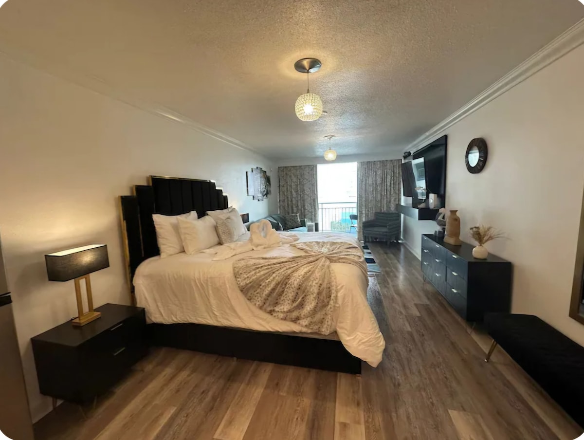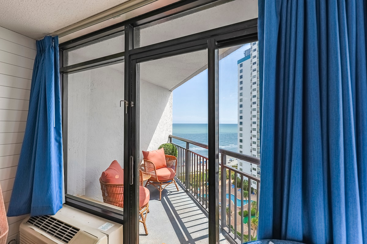 Stiúideo cluthar ar imeall na farraige ag 1605 S Ocean Blvd Radharc álainn gan bhac ar an aigéan ó do leaba mhór laistigh de chúinne! Suite go hard ar an 21ú hurlár taobh istigh de The Palace Resort. Féach ar an gcósta ar feadh na mílte! Wi - Fi agus páirceáil saor in aisce. Rochtain ar go leor linnte snámha lonracha agus tobán te, beár, bialann, stuara, agus putt putt ar fad ar an láthair. Níl ach nóiméad ón aerfort. Laistigh d'achar siúil/turas gairid i gcarr chuig siopaí uachtair reoite, bialanna, beáir, spraoi agus siamsaíocht!