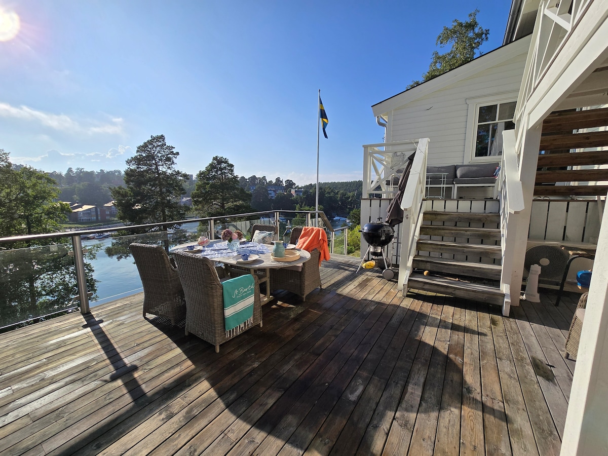Críochnaíodh ár dteach iontach in 2013, tá sé tógtha ar aill ina ndearnadh forléargas ar na huiscebhealaí a théann isteach go Stócólm. Síneann an ghné ó dheas le radhairc ón oirthear go dtí an iarthar. Trá phríobháideach, lamairne agus sabhna adhmaid. Tá máistirsheomra leapa amháin sa teach, 2 sheomra leapa móide cábán beag (teach aíochta, seomra leapa uimh. 4, am samhraidh ar fáil amháin). Tá tolglann, tobán te, cistin lasmuigh agus teallach/beárbaiciú oscailte ar an deic. Táimid lonnaithe 30 nóiméad ó lár Stócólm, 10 nóiméad ó ionad siopadóireachta.