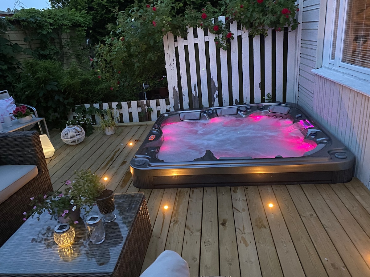 Arty villa 11 km from Stockholm Center. The styling is eclectic, modern with lots of art works on the walls, as well as other design objects. and fireplace.. Luxurious newly renovated kitchen. The spacious living room has a 75 inch LED TV, with Netflix, HBO, Apple TV, Chromecast. Hot tub spa with massage for a family. Wifi, one parking space.. Very safe neighbourhood. Close to a park forest with a 16th century mansion with a café. Also near top notch bakery + 2 food stores and 5-6 restaurants.