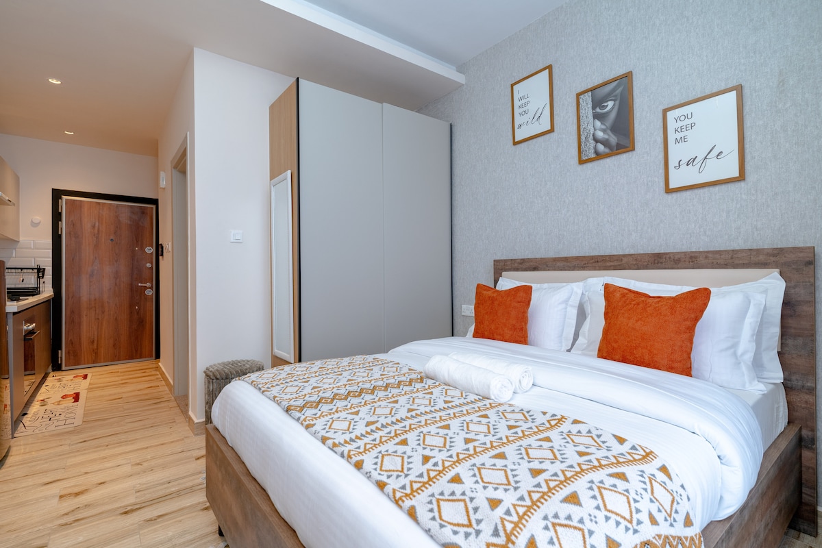Tá an foirgneamh suite ar bhóthar na hEaglaise, Westlands. Tá seomra leapa fairsing inár n - árasán ina bhfuil leaba rímhéide shómasach, ag gealladh oícheanta suaimhneacha duit tar éis laethanta lán d'eachtra nó d'obair. Tá an leaba maisithe le línéadach tí den scoth, piliúir phluise, agus duivé teolaí, rud a chinntíonn an compord is fearr. Ní hamháin go dtuileann na fuinneoga ón urlár go dtí an tsíleáil an seomra le solas nádúrtha ach cuireann siad radhairc iontacha ar fáil freisin ar spéirlíne dhinimiciúil Nairobi, rud a fhágann go bhfuil do mhaidin níos gile agus do thráthnóna níos spéisiúla.