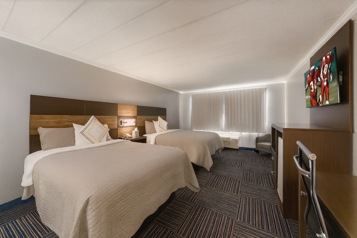 Bring the whole crew to our QQ room at 21 Broad, featuring two comfy queen-size beds—perfect for families or friends seeking space and comfort. Enjoy modern perks like complimentary WiFi, air conditioning, and a sleek private bathroom, all set in a stylish Cape Cod retreat close to the heart of Nantucket!