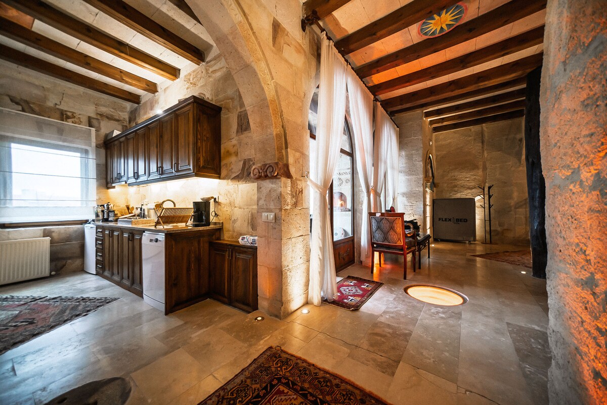 Bí i do chónaí i lúbra! Tá páirceáil agus bealach isteach príobháideach, 3 sheomra leapa, 4 sheomra folctha, bia & seomraí suí, cistin lánfheistithe & lochtán príobháideach do 4 go 6 thaistealaí: máistirsheomra leapa le leapacha banríona & dúbailte; 2ú seomra leapa le leaba dhúbailte, 3ú le leaba bhanríona. Fuaraigh & ciúin, le fuinneoga le haghaidh go leor solais. Taitneoidh an t - atmaisféar traidisiúnta Cappadocian leat, sonraí atá snoite sa chloch órga, sna feistis seandachtaí, na háiseanna nua - aimseartha go léir & an príomhshuíomh in aice le bialanna agus suíomhanna.