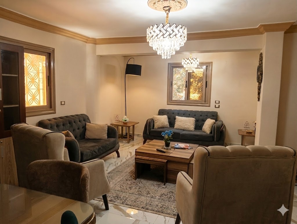 Lonnaithe i gceann de na pobail is lárnaí agus is sláine in Cairo, tá seomra leapa compordach, cistin lánfheistithe, agus áit chónaithe gheal inár n - árasán ina bhfuil fuinneoga móra a ligeann neart solais nádúrtha isteach. Tá an gairdín feistithe go hiomlán le: Luascán – oiriúnach chun do scíth a ligean le leabhar nó díreach taitneamh a bhaint as an mbráca. Tolg compordach ina bhfuil dhá chathaoir agus tábla – foirfe do chaife ar maidin, do bhéilí lasmuigh, nó do dheochanna tráthnóna 10 nóiméad ar shiúl ó Aerfort Cairo 10 nóiméad ar shiúl ó El Rehab City