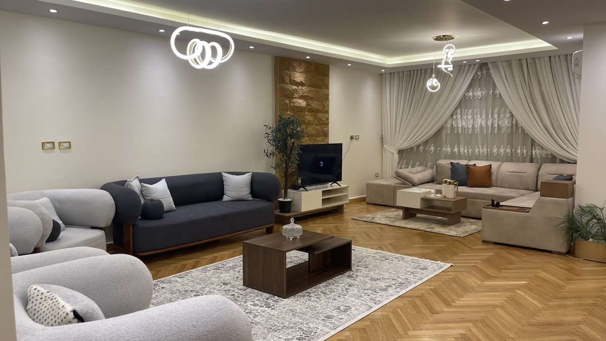 Experience the ultimate in modern comfort in our new 2-bedroom,1sofa bed 2-bathroom apartment suitable for 5 persons,Every inch of this stylish space is new and designed to make your stay unforgettable Our apartment is perfect for families or a business trip. You’ll find all the amenities you need, including a fully equipped kitchen, a comfortable living area Located in a prime compund, you’re just a short way from restaurants,shops in tagamoa and naser city Book now,,We can’t wait to host you!