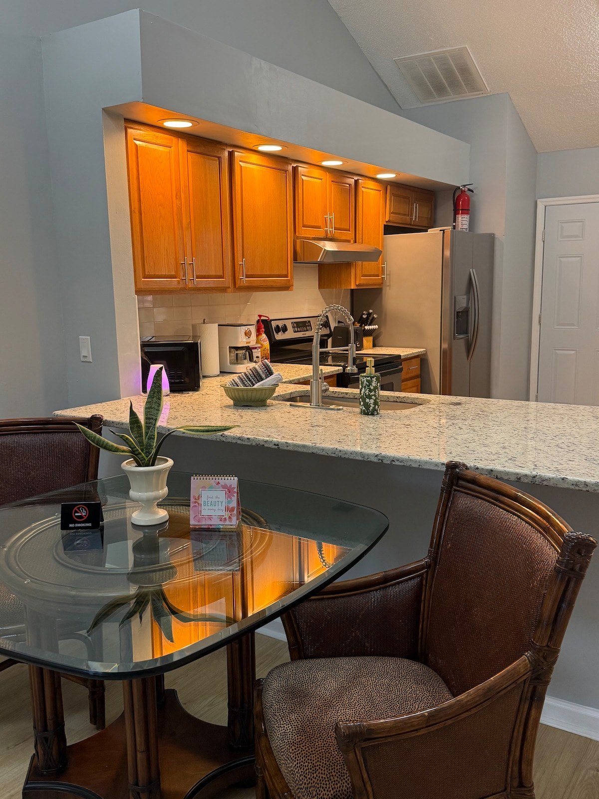 Táimid ar bís go bhfuil tú linn! Tá an teach 4 sheomra leapa seo foirfe do theaghlaigh. • 15 nóiméad chuig Clinic Mhaigh Eo • 10 nóiméad chuig UNF • 8 nóiméad go dtí Neptune Beach • 15 nóiméad go dtí Bunáit Chabhlaigh Mayport • 20 nóiméad chuig an Aerfort Neart bialanna agus siopaí grósaera in aice láimhe. Tá an chistin feistithe le gach rud atá uait. Tá déantóir caife ann le haghaidh caife úr ar maidin. Cuirimid idirlíon ardluais ar fáil freisin do do ghléasanna go léir. Is teilifíseáin chliste iad na 3 theilifíseán ar fad a bhfuil rochtain acu ar aipeanna amhail Netflix